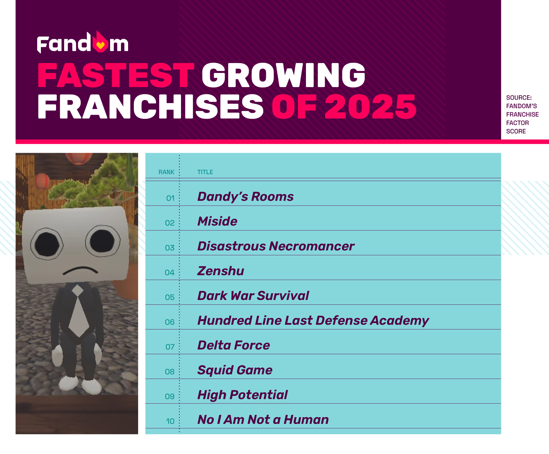 The Franchise Factor Score is a weighted calculation against five criteria: Worldbuilding, High Critical and Fan Ratings, Fierce Fanbase, Cultural Relevance, and Consistency. These insights were analyzed and validated through Fandom’s robust proprietary first-party data — more than 350 million monthly unique visitors and 50 million pages of content across 250,000 wiki communities. This methodology provides a 360-degree view of franchises and fan interest across the entertainment and gaming landscape through the eyes of Fandom.